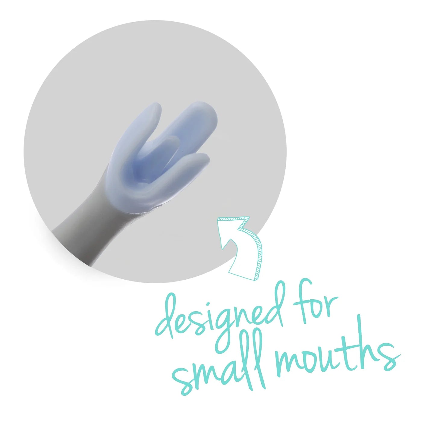 The unique deep scoop spoon shape and angled handles encourages correct hand to mouth positioning, and helps to contain food within the spoon as bubs practices bringing it to his/her mouth, which means more food makes it to the mouth and less mess!