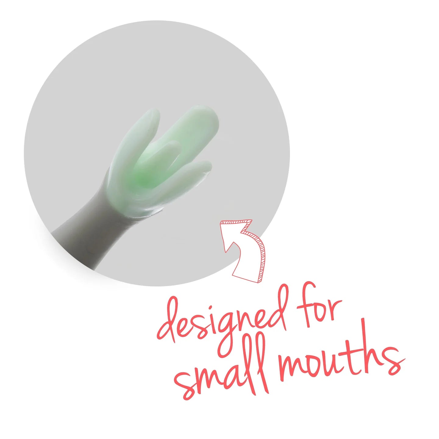 The unique deep scoop spoon shape and angled handles encourages correct hand to mouth positioning, and helps to contain food within the spoon as bubs practices bringing it to his/her mouth, which means more food makes it to the mouth and less mess!