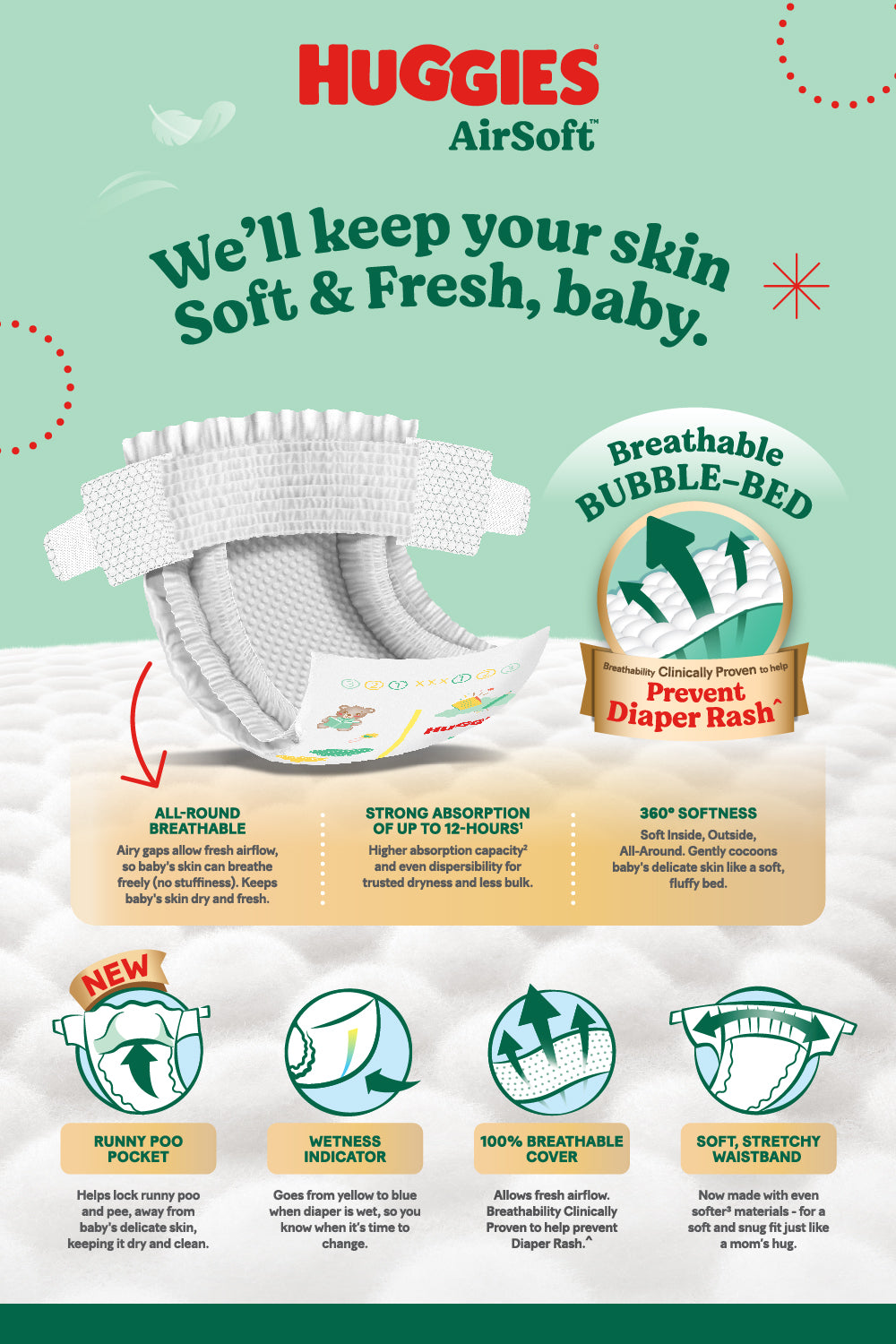 Huggies AirSoft range provides 12hours of comfort, at an affordable price range so baby can play and sleep easy just like ABC.