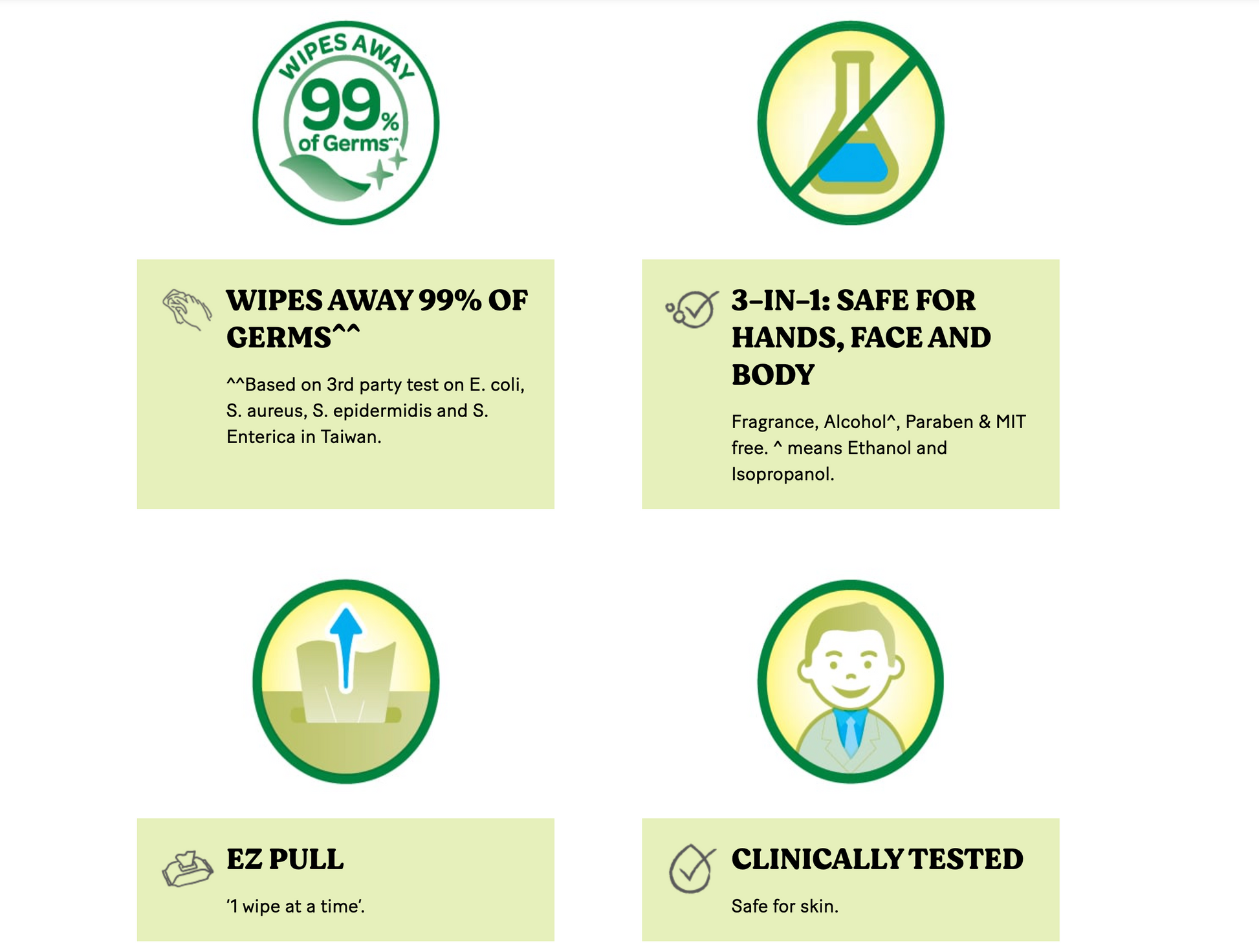 - Thick, soft, and absorbent which help wipe away 99% of germs (including E.Coli, S.Aureus, S.Epidermis and S.Enterica)
