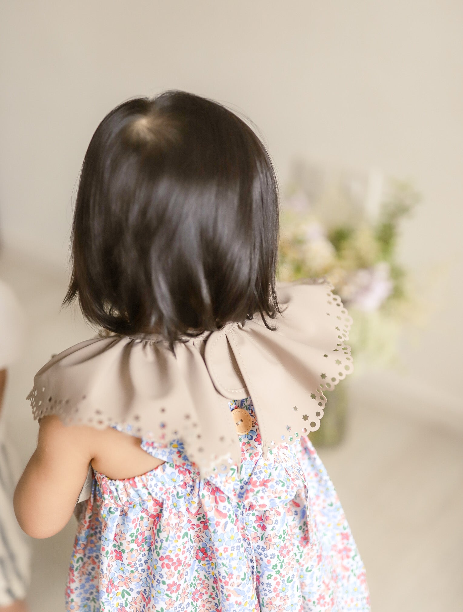 A lightweight, waterproof baby bib featuring a Pierrot collar, a lined front pocket and velcro fastening on the back. It is made of the softest, sturdiest OEKO-TEX certified polyester that resists stains and is easily wiped clean on the go or in the washing machine with laundry bag.