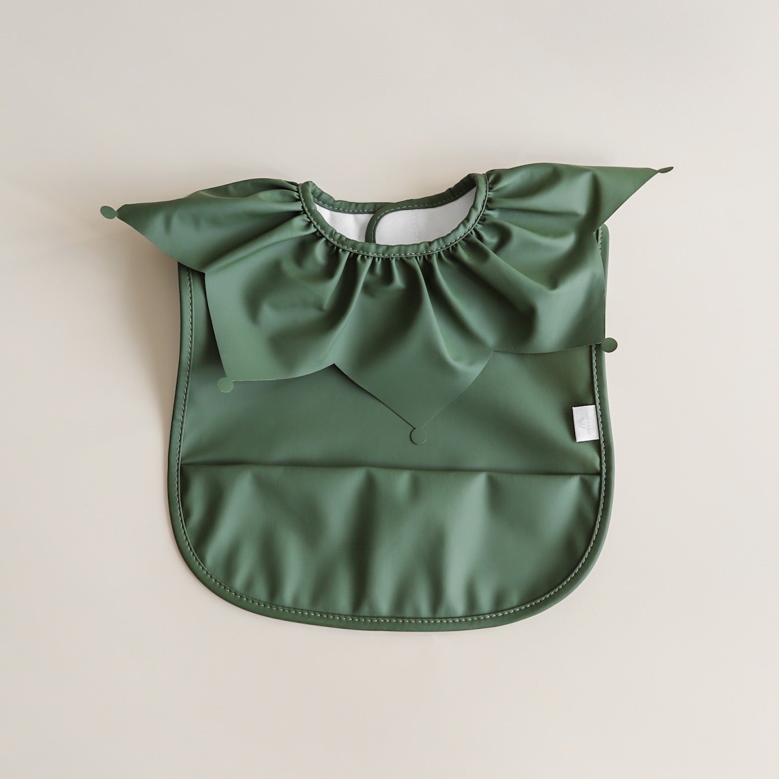 A lightweight, waterproof baby bib featuring a Pierrot collar, a lined front pocket and velcro fastening on the back.